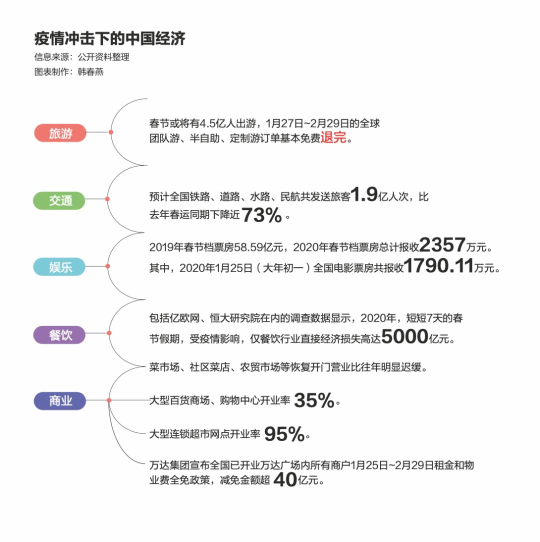 可以说,疫情对中国经济的影响是多方面的。单从消费和服务业来看,旅游业、影视娱乐业、餐饮业、生活日用品百货消费行业瞬间停摆,若疫情持续三个月以上,造成的损失难以估量。